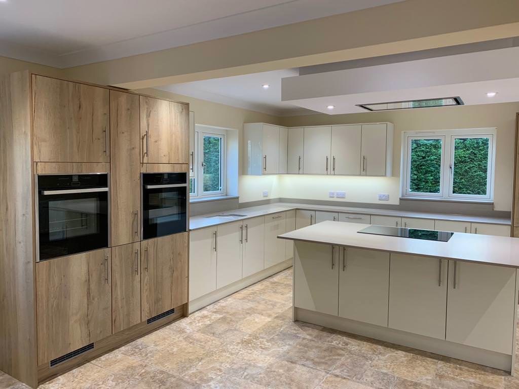 Kitchen installation for Mrs Gale, including Slab door in Driftwood Light Grey and Fjord Metallic doors with Blanco Stella Quartz worktops.